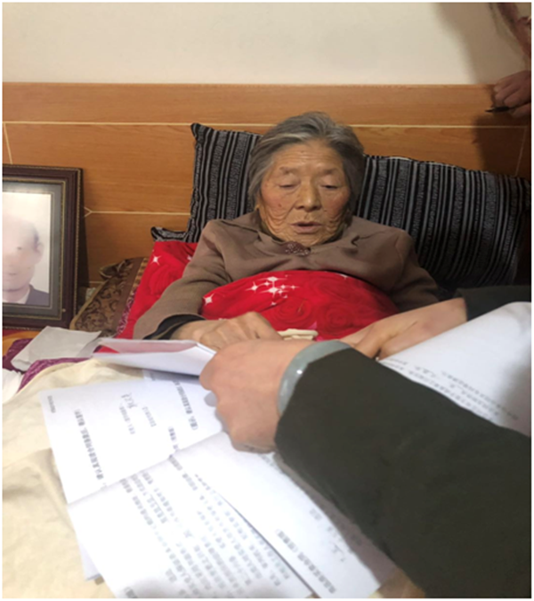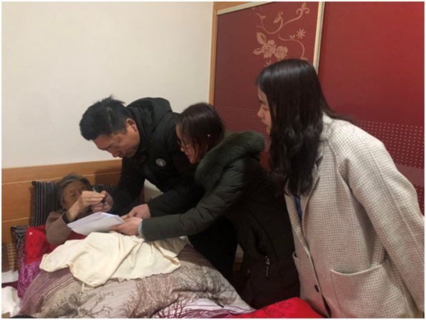 根據(jù)制度規(guī)定,不動產(chǎn)登記前期手續(xù)需本人親自帶上相關(guān)材料到場辦理,但耿漢英老人生病臥床,無法到置業(yè)營銷部進行面簽。該部門了解這一情況后,立即安排兩名工作人員帶上商品房買賣合同、詢問筆錄等相關(guān)資料開展上門服務(wù),見證當(dāng)事人簽字按章,并進行拍照留檔,圓滿完成了房屋登記辦理前期手續(xù),為老人家庭排憂解難。